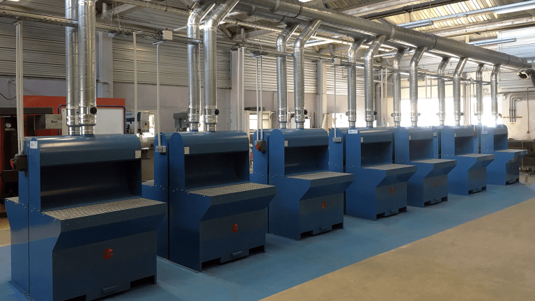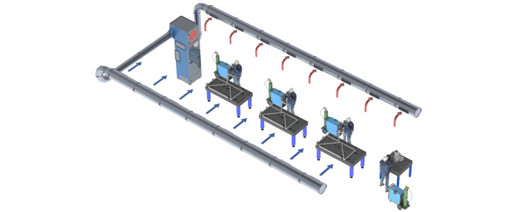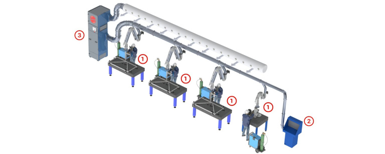 Welding fumes or metal grinding and cutting waste are sucked directly from the pollution source through extraction arms or extraction table.